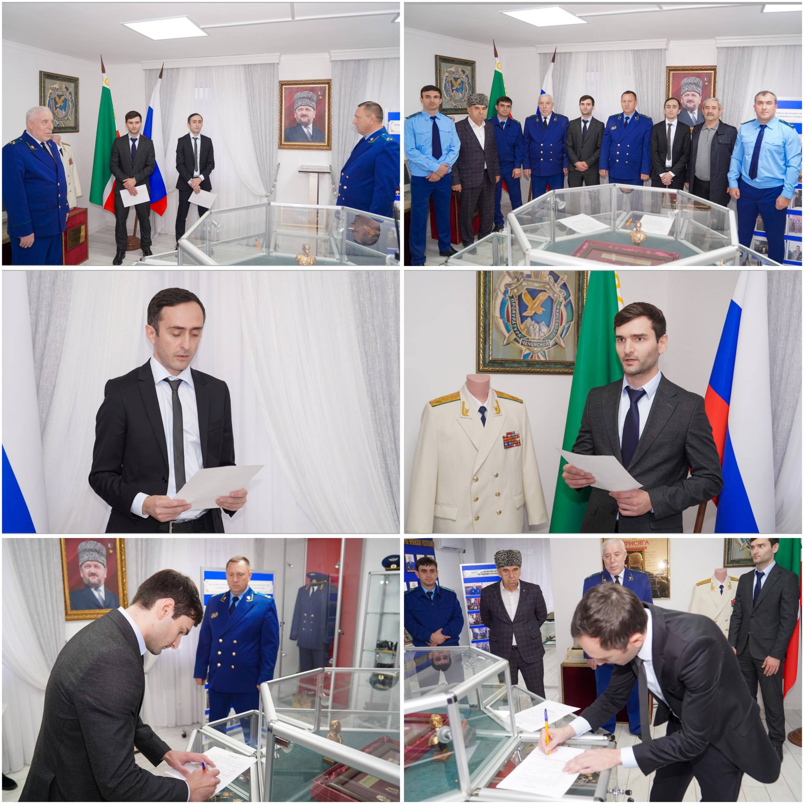 В соответствии с поручением прокурора республики Арсана Адаева в целях формирования социально значимых патриотически ориентированных ценностей, взглядов и убеждений у молодых специалистов в музее прокуратуры республики состоялось мероприятие, посвященное торжественному принятию Присяги прокурора помощниками прокуроров Грозненского и Наурского районов Магомедом Ильхаевым и Магомед-Эмином Нагаевым.