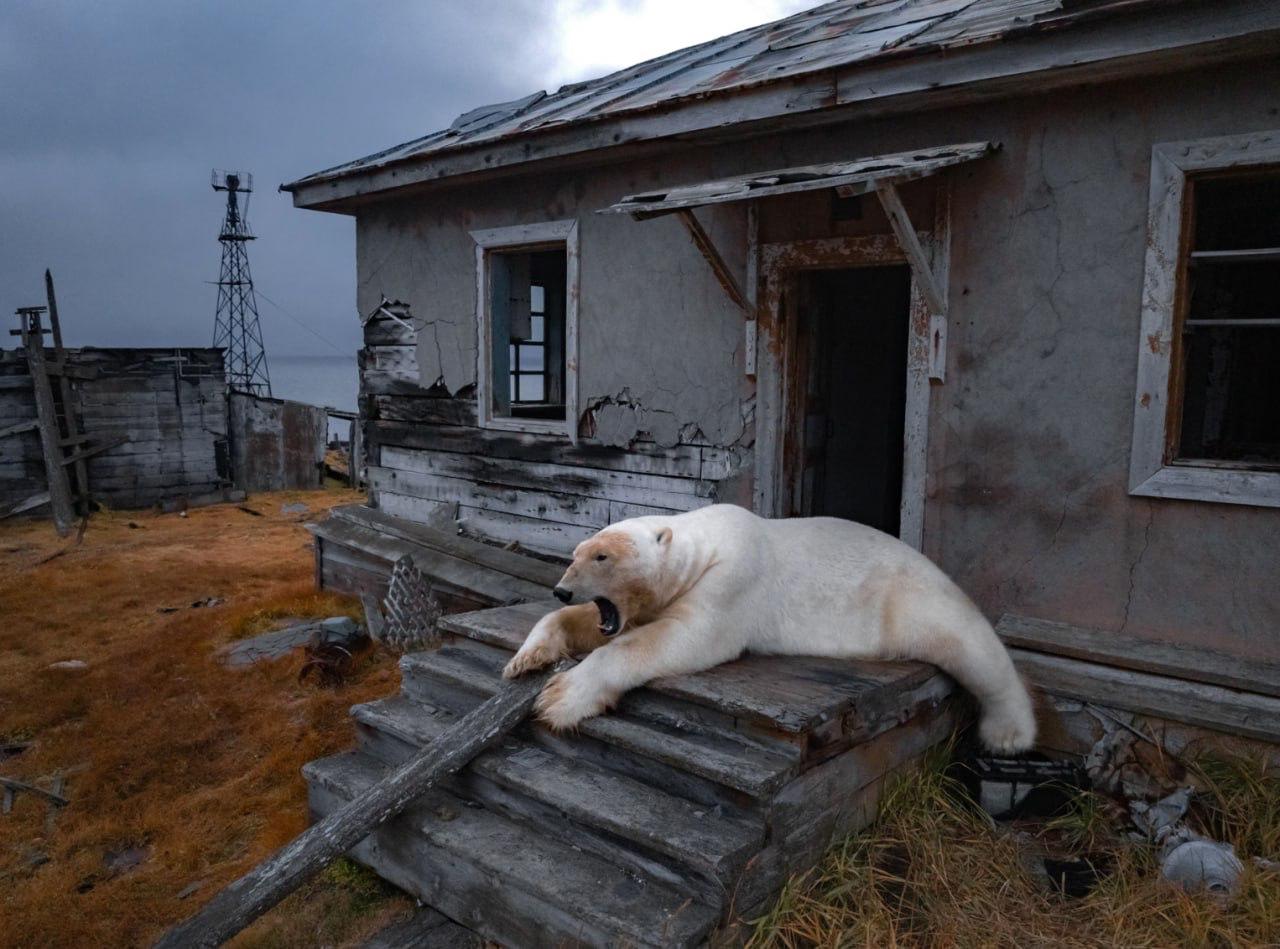На фото белый медведь на заброшенной станции на Чукотке, снято с дрона фотографом Вадимом Махоровым. Сообщают, что 20 медведей сделали из зданий убежище.