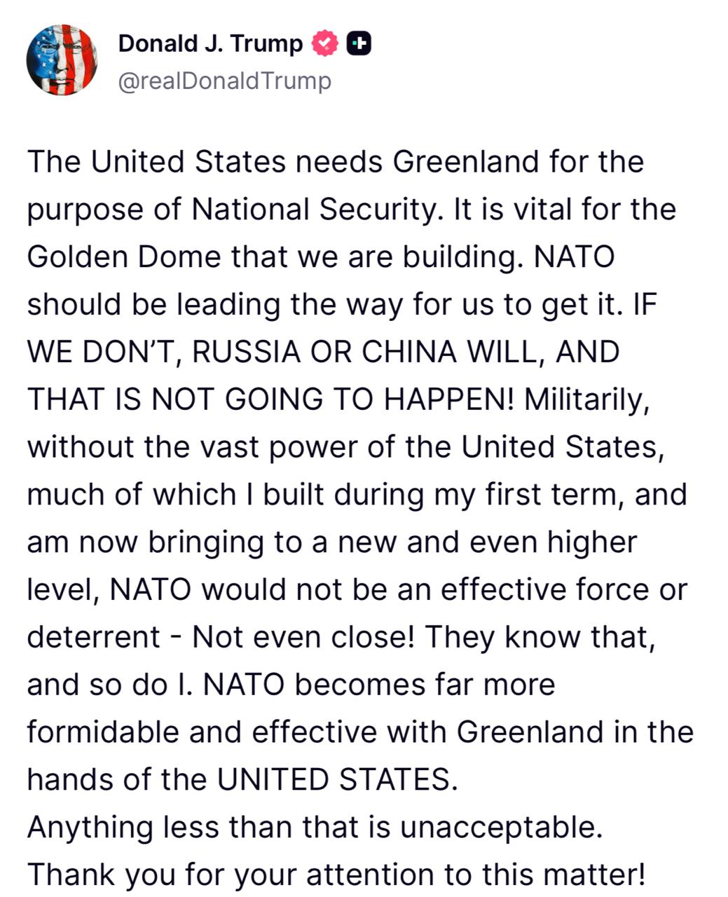 В военном отношении без огромной мощи Соединенных Штатов, большую часть которой я создал во время своего первого президентского срока и которую сейчас поднимаю на новый, еще более высокий уровень, НАТО не была бы эффективной силой или средством сдерживания - даже близко не было бы! Они знают это, и я тоже. НАТО становится гораздо более грозным и эффективным с переходом Гренландии в руки США. Все, что меньше этого, неприемлемо.