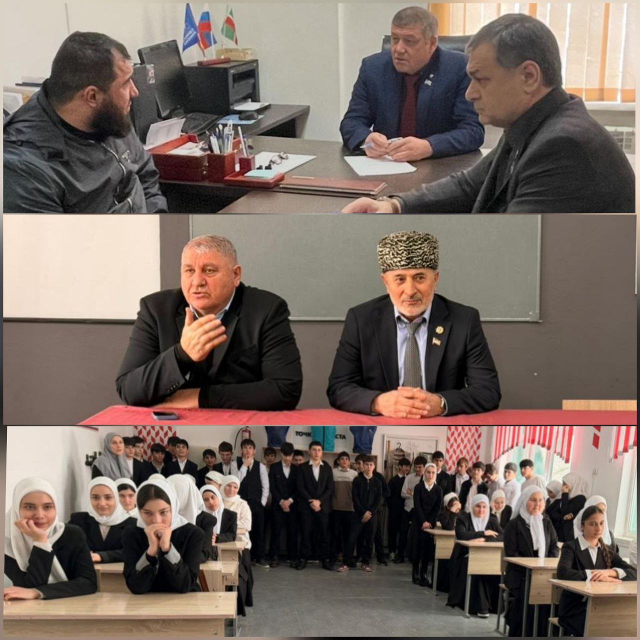 Депутат Парламента ЧР Сулумбек Демилханов вместе с председателем Совета депутатов Шелковского муниципального района Борисом Наиповым провел встречу с учащимися СОШ ст. Старощедринская.