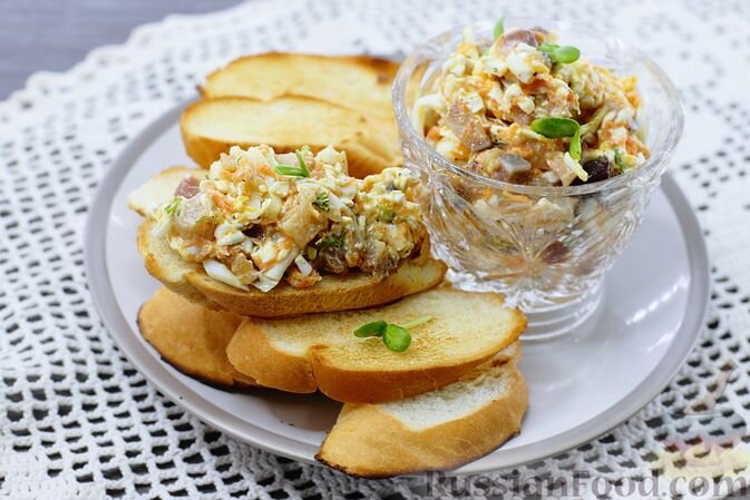- Закуска из селёдки с морковью и яйцами – на них можно смело класть в тарталетки или подавать с хрустящими тостами. Нежное сочетание солёной рыбы и сладкой моркови обязательно понравится всем.