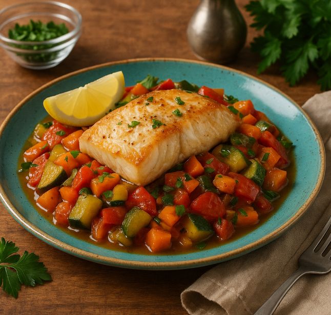 5. Рыба на результат: На другой сковороде обжарьте рыбу до золотистой корочки, после чего аккуратно соедините с тушеными овощами. Тушите еще 5–7 минут.