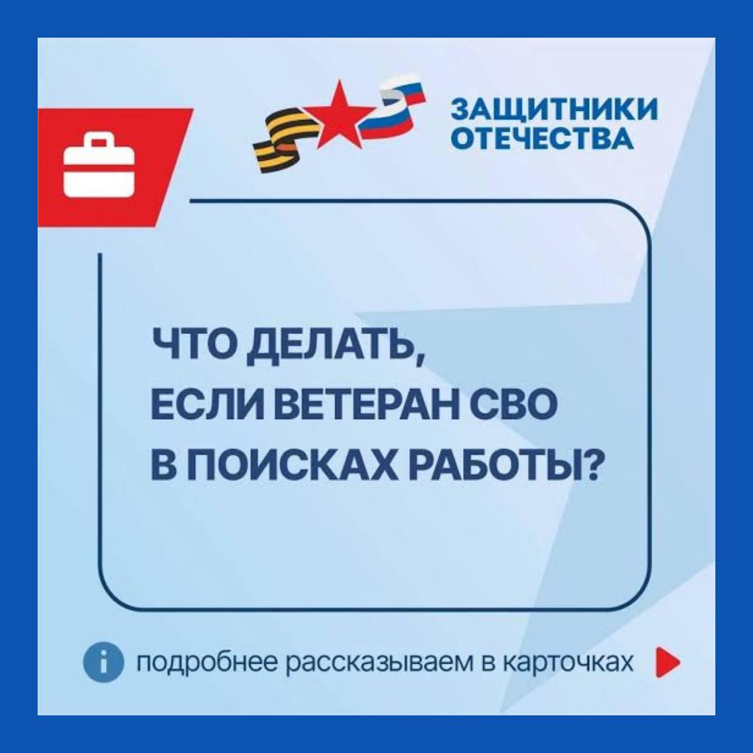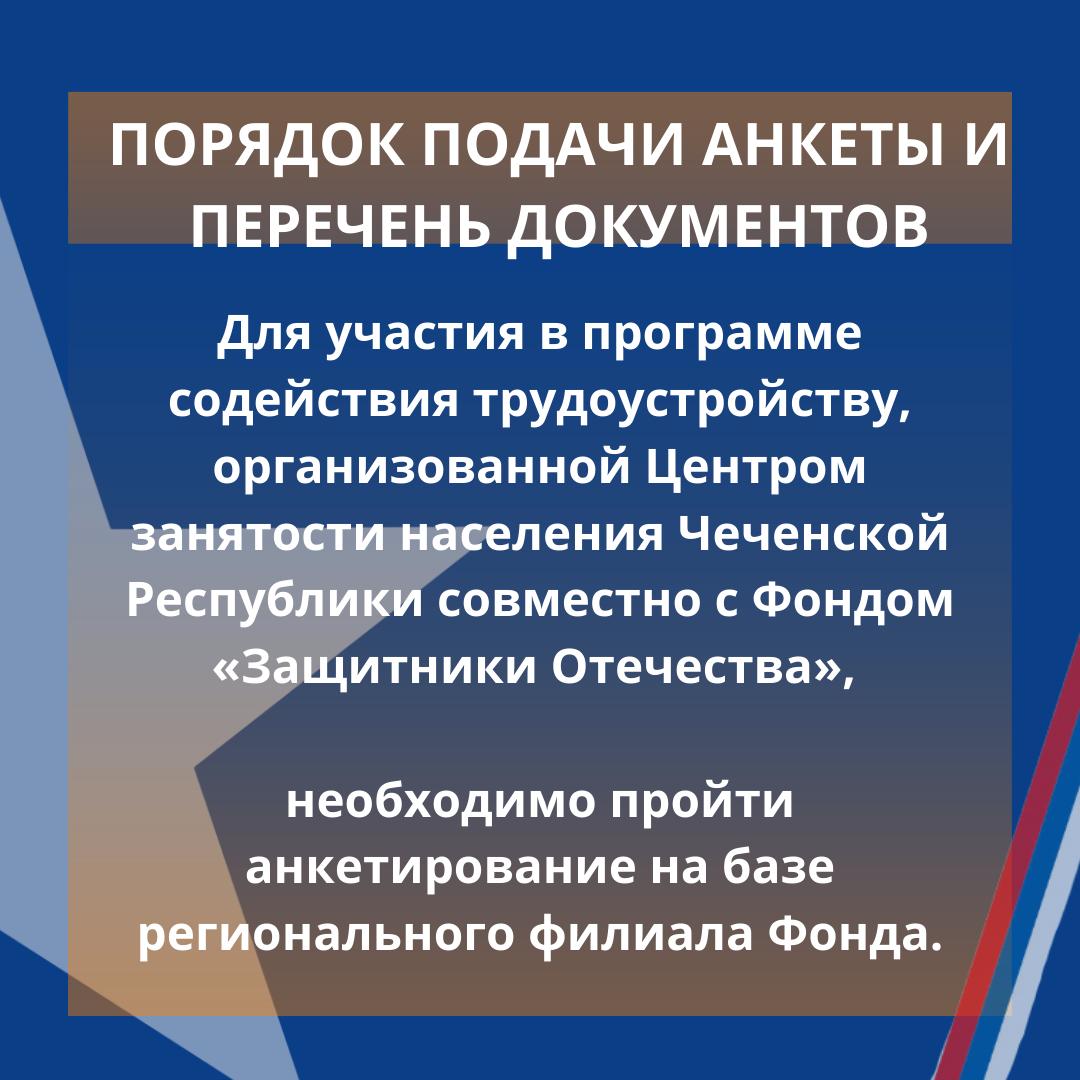 Филиал Государственного Фонда поддержки участников СВО "Защитники Отечества" в Чеченской Республике совместно с Государственным бюджетным учреждением "Управляющий Центр занятости населения" Министерства труда, занятости и социального развития ЧР объявляет о проведении мероприятия по содействию трудоустройству ветеранов специальной военной операции, демобилизованных военнослужащих и членов семей погибших защитников Отечества.