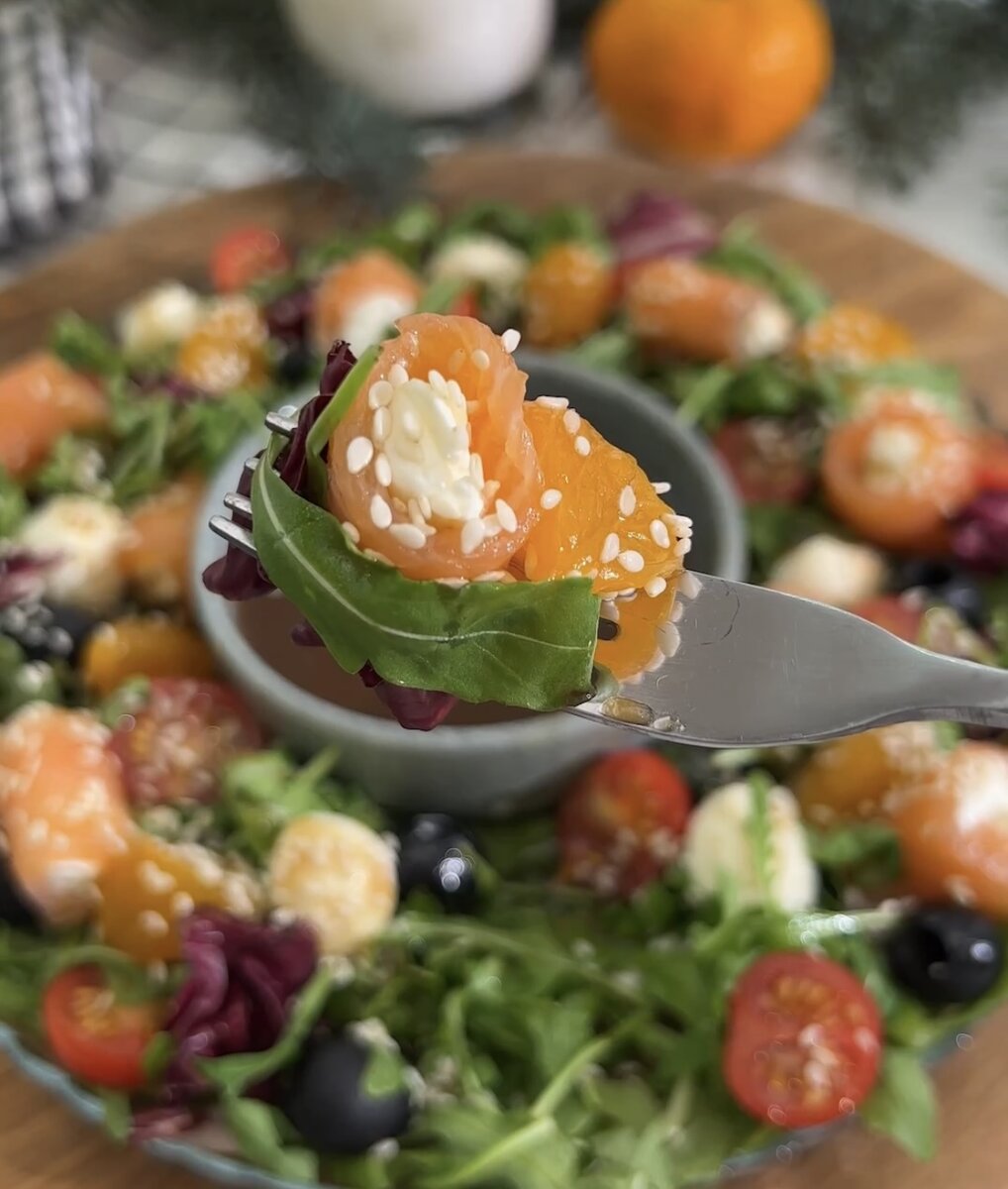 Следующий шаг: собрать салат. Для этого понадобится большое кругное блюдо и небольшая пиала для заправки. Соус можно быстро приготовить, смешав мед, горчицу, бальзамический уксус и оливковое масло до однородной массы. Теперь, когда все готово, можно начать формировать сам салат. Начать лучше с зелени, дополненной дольками очищенного мандарина и оливками. Помидоры Черри лучше порезать пополам и аккуратно уложить сверху, затем разместить сыр моцарелла и рулеты из рыбы как по кругу, так и внутри венка.