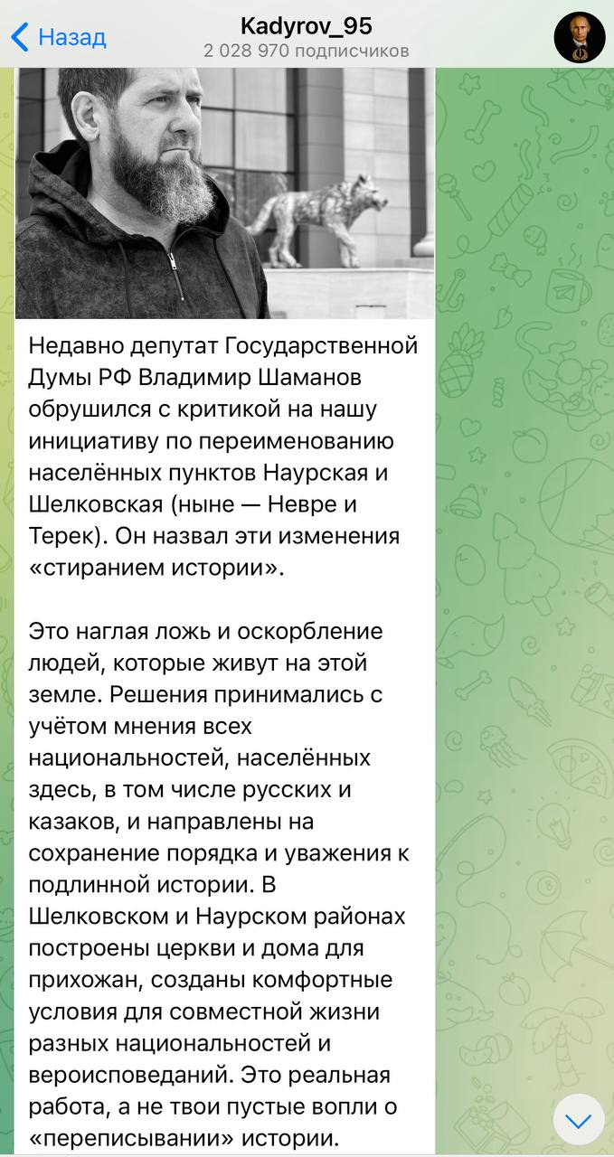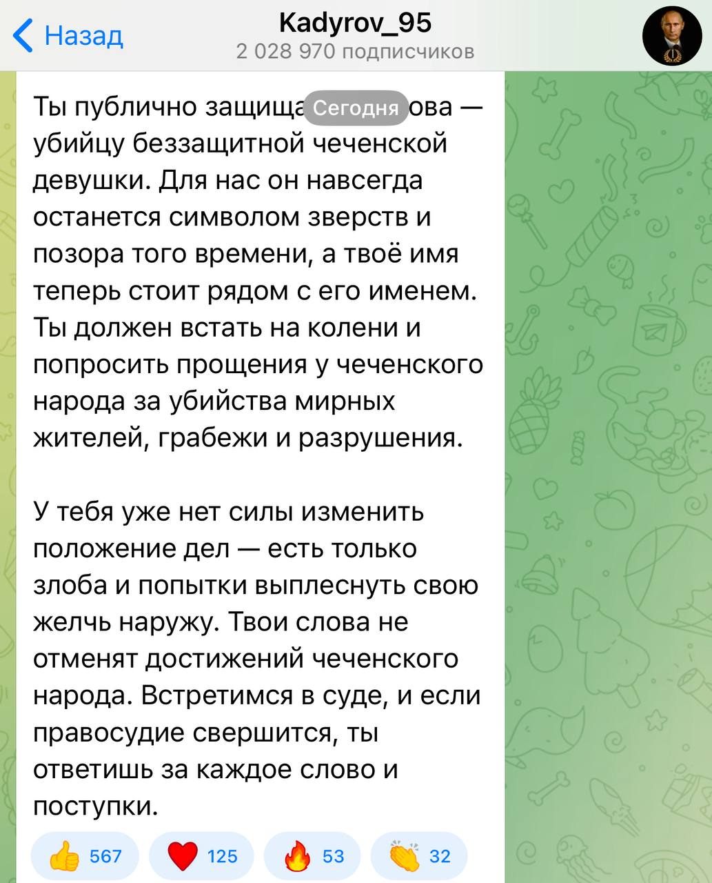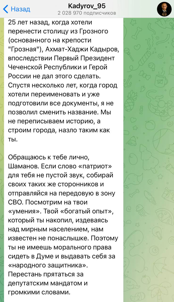 Кадыров обрушился с оскорблениями на русского генерала Владимира Шаманова, который много лет рисковал жизнью, наводил конституционный порядок в Чечне и освобождал её от террористов. Сама по себе ведь она не освобождалась от террористов, без русского солдата никак.
