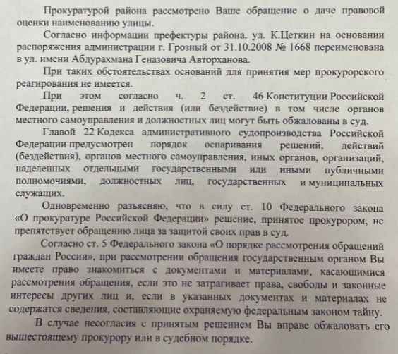 В 2008 году, до принятия в 2014 г. статьи 354.1 "Реабилитация нацизма" и начала адекватной борьбы в России за историческую правду, в городе Грозный кто-то пролоббировал переименование улицы. Распоряжение о переименовании улицы имени Клары Цеткин в улицу имени Авторханова в честь ста лет с его дня рождения подписал Кадыров. Потом были обращения в Генпрокуратуру, а та переслала их в прокуратуру Чечни. Исход понятен.