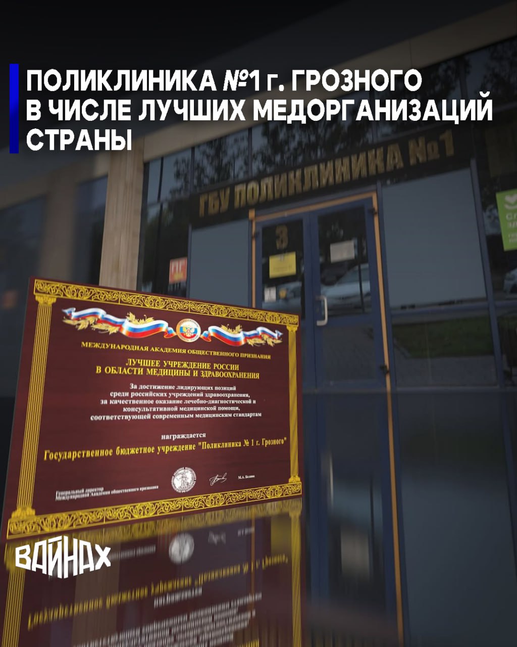 Поликлиника №1 г. Грозного объявлена одной из лучших медорганизаций страны по итогам Всероссийского конкурса «Лучшее учреждение РФ в области медицины и здравоохранения». Международная академия общественного признания вручила ей диплом и сертификат лауреата. Об этом сообщил министр здравоохранения региона Адам Алханов на своей странице в социальной сети.