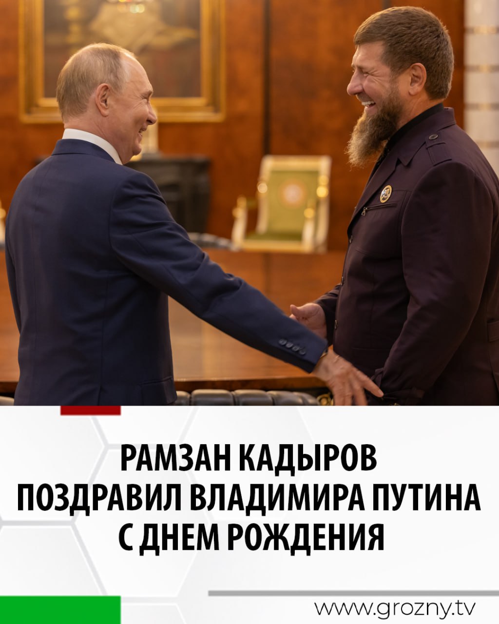 «Благодаря этой решимости и доверию сегодня республика живёт, развивается и гордится тем, что является прочной, неотъемлемой частью великой России. Я от всей души поздравляю Владимира Владимировича с днём рождения! Искренне желаю ему крепкого здоровья, благополучия, счастья, долгих лет жизни, удачи и успехов в его нелегкой работе», - заключил Рамзан Кадыров.