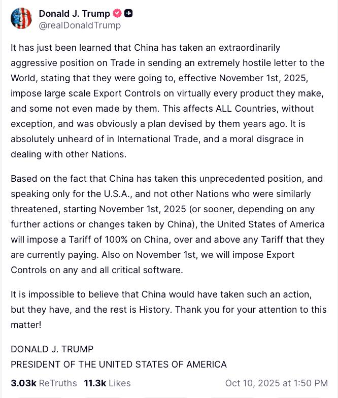 В добавок к этому, Трамп анонсировал дополнительные тарифы на китайские товары в размере 100%. Сейчас местные производители обложены пошлиной примерно в 57% — судя по статистике, это средний показатель. Новые тарифы прибавляются сверху, делая экспорт товаров из Китая фактически невозможным.
