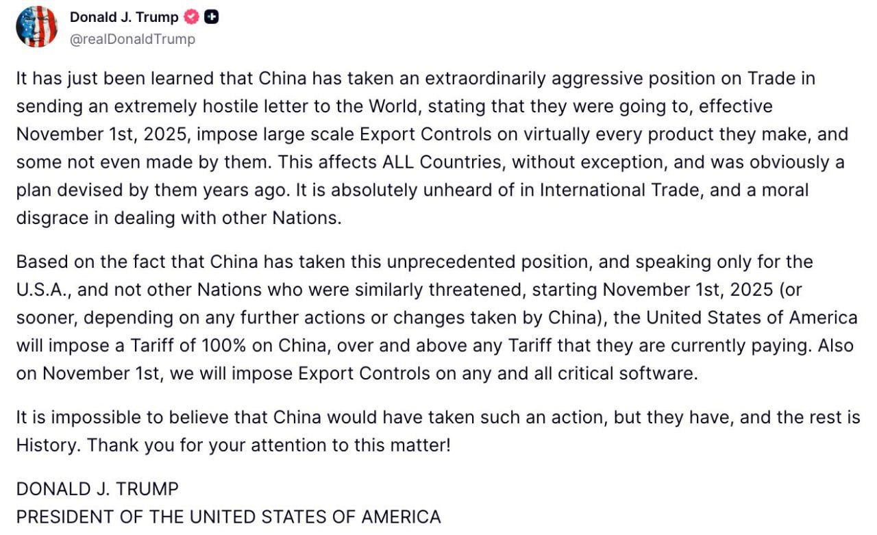 А как же перемирие?Трамп вводит тарифы. ОпятьОтвет Дональда Трампа на действия властей в Китае не заставил себя ждать. Как мы и предполагали, с 1 ноября американцы введут и экспортные ограничения, и новые пошлины на китайские товары.Рестрикции...