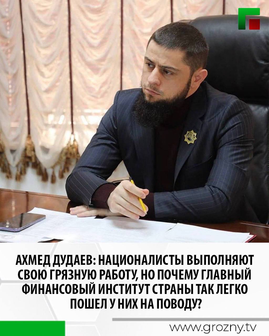 «Ни один наш призыв к голосованию не содержал и намека на разжигание межнациональной розни — в отличие от наших оппонентов. Мы просто честно голосовали — и вырвались вперед благодаря народной поддержке. Но едва мы возглавили рейтинг, как наши оппоненты, по известной русской пословице «на воре и шапка горит», начали кричать о неких накрутках, оскорбляя теперь уже и Центробанк, и чеченцев, требуя в ультимативной форме отменить все способы голосования, кроме «Госуслуг». Видимо они досконально знают, как осуществляются подобные махинации даже на максимально защищенном сайте Центробанка. Так может, стоит проверить именно их на предмет использования криминальных схем? Но ЦБ, место того чтобы дать правовую оценку откровенно экстремистским призывам и защитить свою репутацию от публичной дискредитации… спешно выполняет все требования националистов именно в тот момент, когда «Грозный сити» значительно вырвался вперед. Все способы голосования, кроме одного, были ликвидированы. И тут вдруг уже набранные голоса за «Грозный Сити» начинают таинственным образом снижаться, а показатели наших оппонентов — демонстрировать «феноменальный» рост, прибавляя по 20 тысяч в час. Позвольте поинтересоваться, какова юридическая и техническая природа этой «магии»? И почему лишили права голоса тех, кто хочет выбрать или уже выбрал «Грозный сити»? Националисты то, разобщающие народы, выполняют свою грязную работу, но почему главный финансовый институт страны так легко пошел у них на поводу?», - заявил министр.