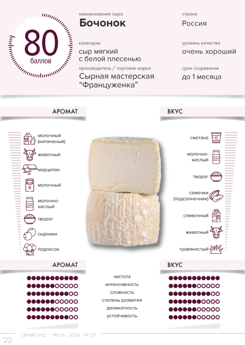 Сырная мастерская «Француженка» предлагает уникальный сыр под названием Бочонок, который выделяется своей привлекательной внешностью и богатым вкусом. Этот сыр обладает сложной ароматикой и превосходной текстурой, что делает его отличным выбором для тех, кто хочет попробовать сыры из козьего молока, но не готов к яркому козьему аромату. Его мягкий, гармоничный вкус хорошо вписывается в любые холодные закуски и станет изюминкой сырной тарелки.