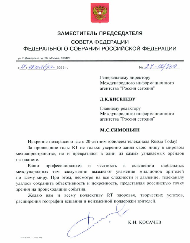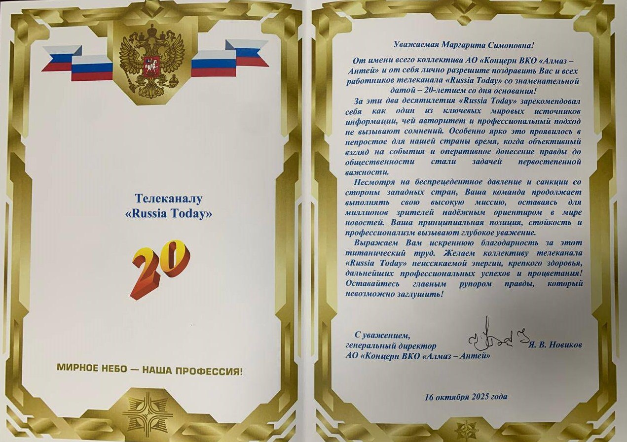 «За эти два десятилетия RT зарекомендовал себя как один из ключевых мировых источников информации, чей авторитет и профессиональный подход не вызывают сомнений. Особенно ярко это проявилось в непростое для нашей страны время, когда объективный взгляд на события и оперативное донесение правды до общественности стали задачей первостепенной важности».