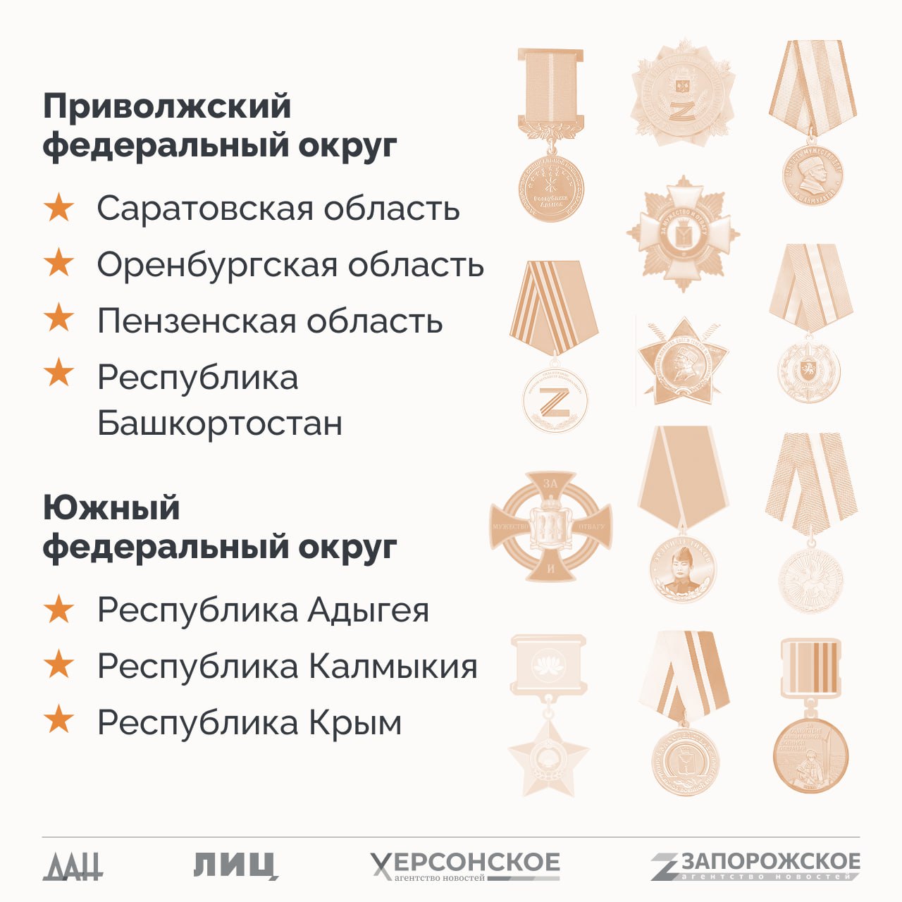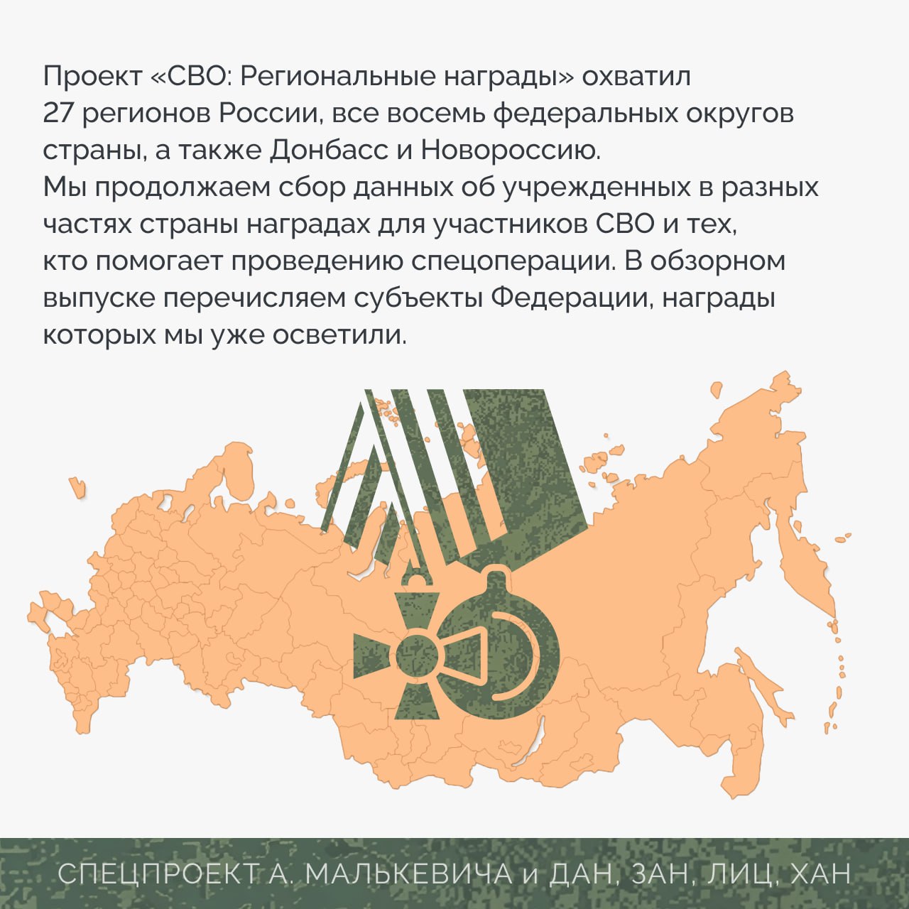 Спецпроект «СВО: Региональные награды» создан информационными агентствами Донбасса и Новороссии – ДАН, ЛИЦ, ЗАН и ХАН – совместно с журналистом Александром Малькевичем.