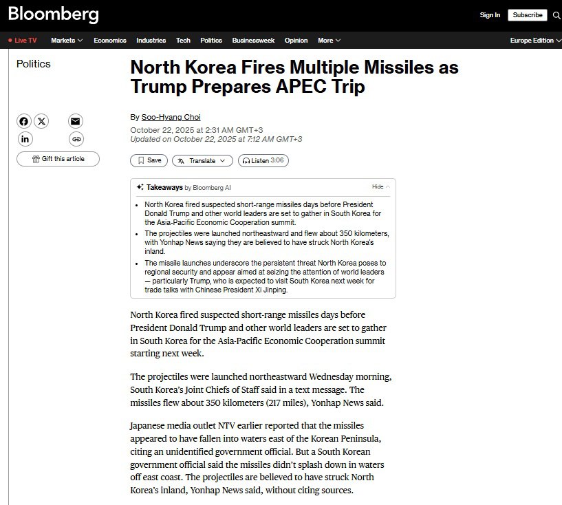 КНДР произвела запуск нескольких баллистических ракет малой дальности в преддверии саммита Азиатско-Тихоокеанского экономического сотрудничества в Южной Корее. Испытания состоялись утром в среду и стали первыми за пять месяцев.