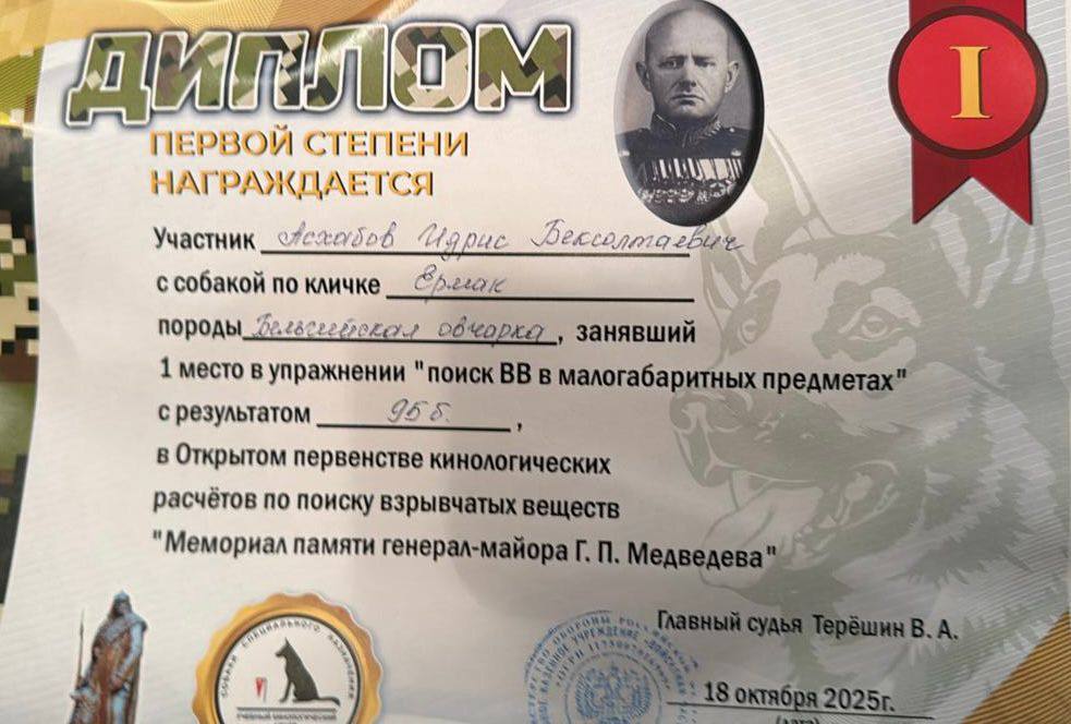 Сотрудник ОМОН «АХМАТ-1» Управления Росгвардии по Чеченской Республике старший сержант полиции Идрис Асхабов и его служебная собака – бельгийская овчарка по кличке Ермак, представляя Северо-Кавказский ордена Жукова округ войск национальной гвардии Российской Федерации, завоевали первое место в Открытом первенстве кинологических расчётов по поиску взрывчатых веществ «Мемориал памяти генерал-майора Г.П. Медведева» в упражнении «Поиск взрывчатых веществ в малогабаритных предметах».