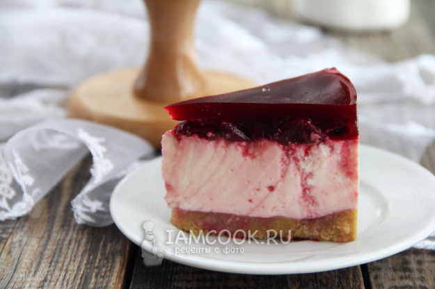 Далее следует приготовить вишнёвый слой: вишню с сахаром прогреть, дать ей пустить сок, после чего откинуть на дуршлаг. Из собранного сока и желе подготовить заливку, доведя до кипения, и аккуратно залить вишни. После того как чизкейк остынет, убрать его в холодильник на ночь для окончательного застывания.