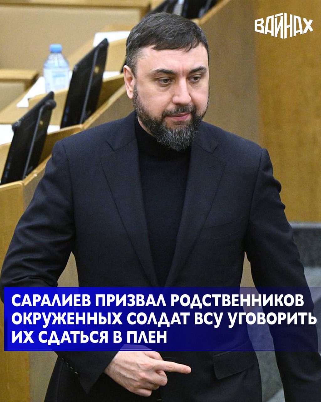 Депутат Государственной думы, Представитель парламентской координационной группы по вопросам СВО Шамсаил Саралиев обратился к родственникам окруженных солдат ВСУ в районах Красноармейска, Димитрова и Купянска с призывом уговорить их сдаться в плен. Соответствующий пост он опубликовал в телеграм-канале.