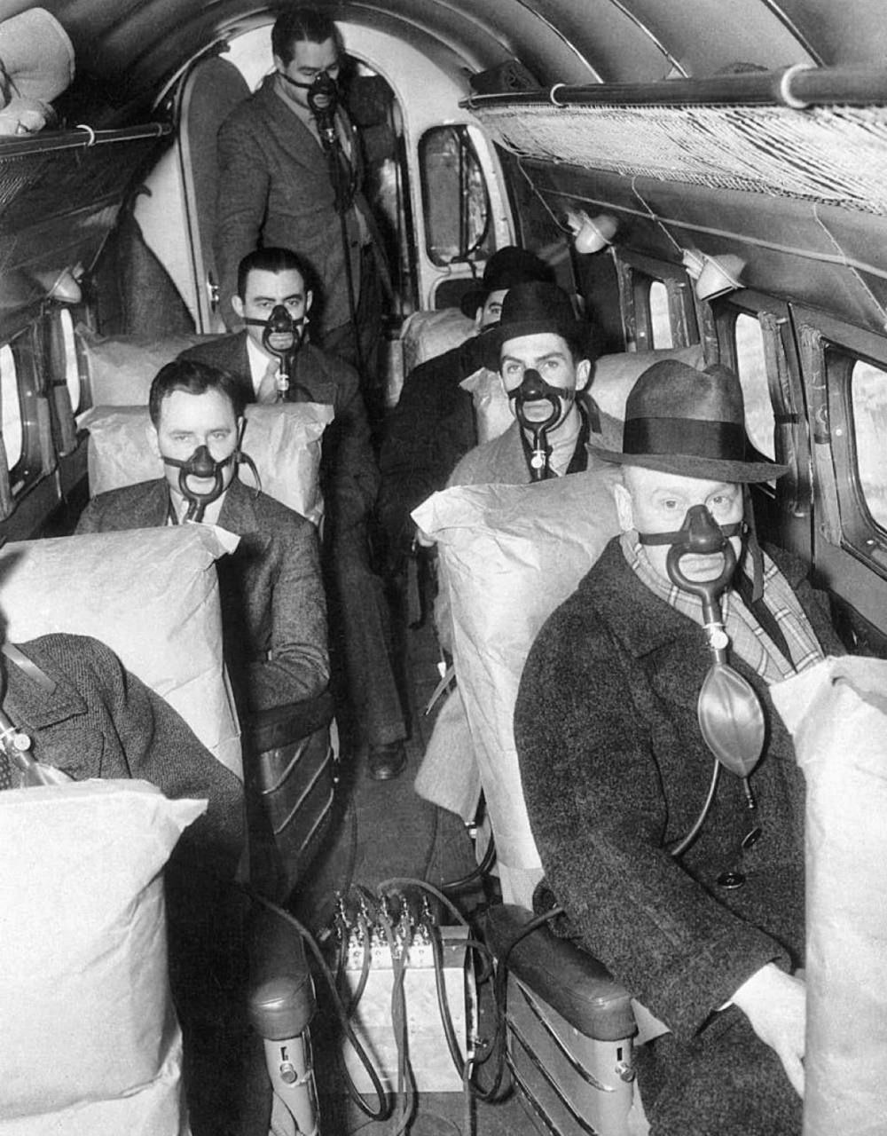 На этой фотографии 1939 года, сделанной на высоте 6 000 метров, пассажиры используют громоздкие кислородные маски как необходимую меру предосторожности против гипоксии, вызванной разреженным воздухом на такой высоте.