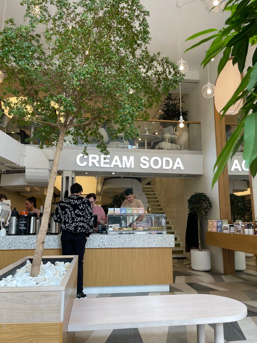 Кафе «Крем Сода» привлекает светлым интерьером и стильным оформлением. Просторные панорамные окна создают атмосферу уюта, а оригинальные стулья и каменные столики лишь подчеркивают общий стиль. Заходя сюда, сразу ощущаешь, что это пространство создано для быстро перекуса, но с душой.