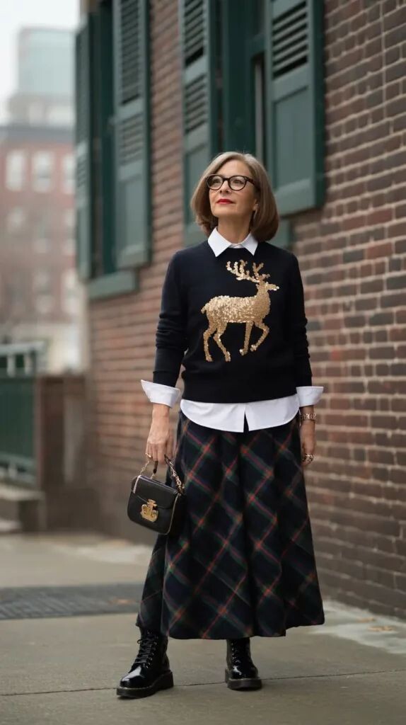 - Твидовая юбка в косую клетку: Прекрасная часть осеннего гардероба. Сочетание с белой рубашкой и чёрным джемпером с золотистой аппликацией создаст весьма элегантный образ, который подчеркнется контрастными ботинками.