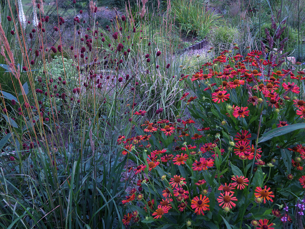 Гелениумы великолепно смотрятся на фоне злаков, образуя живописные композиции. Они не только занимают пространство, но и добавляют яркие акценты среди сухих стеблей. Эта цветочная культура отлично подходит для создания уютного осеннего настроения, как на фото, где на заднем плане просматриваются элементы вербены вместе с гелениумами.