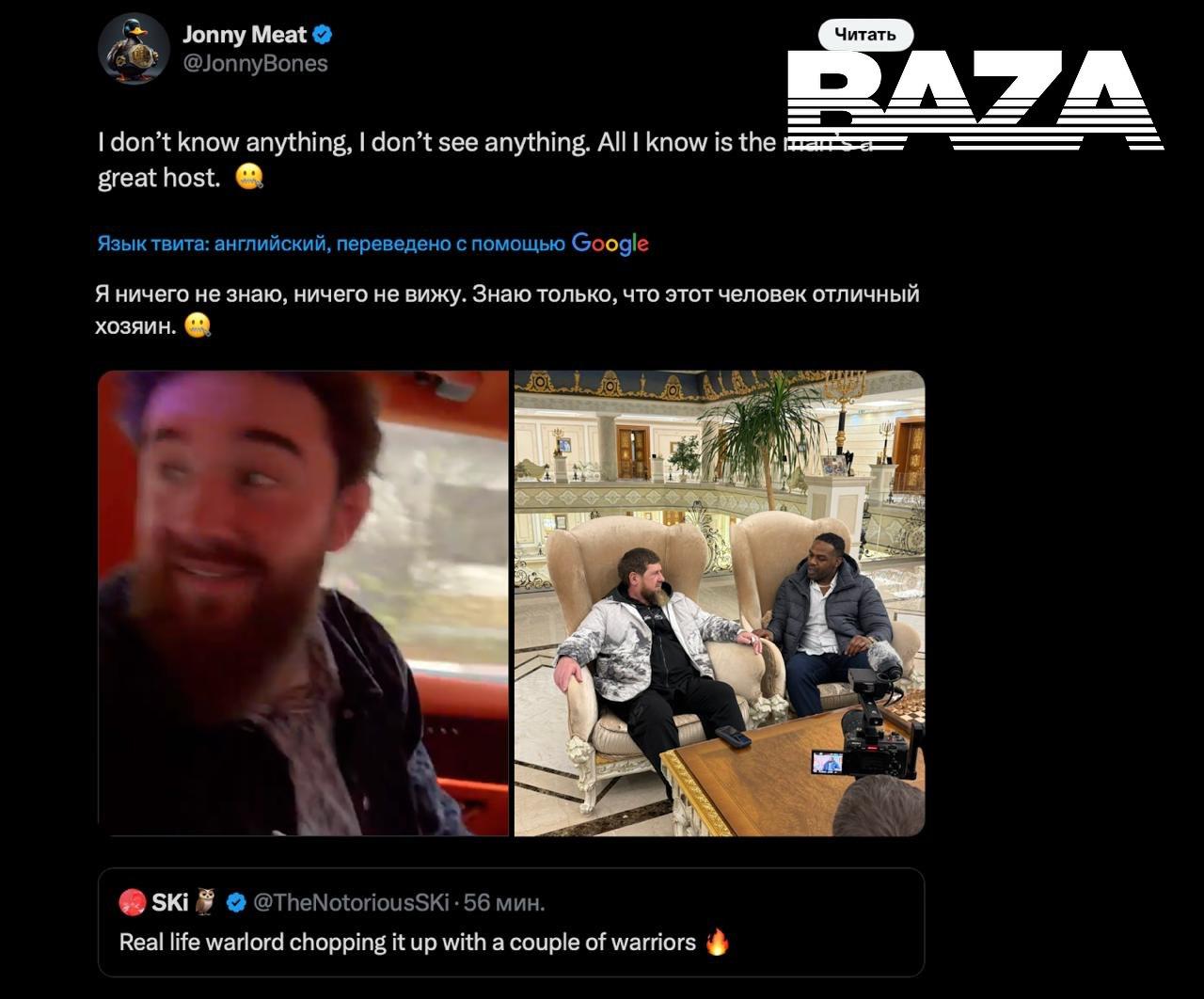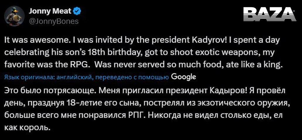 «Это было потрясающе. Меня пригласил президент Кадыров! Я провёл день, празднуя 18-летие его сына, пострелял из экзотического оружия, больше всего мне понравился РПГ. Никогда не видел столько еды, ел как король», — написал он.