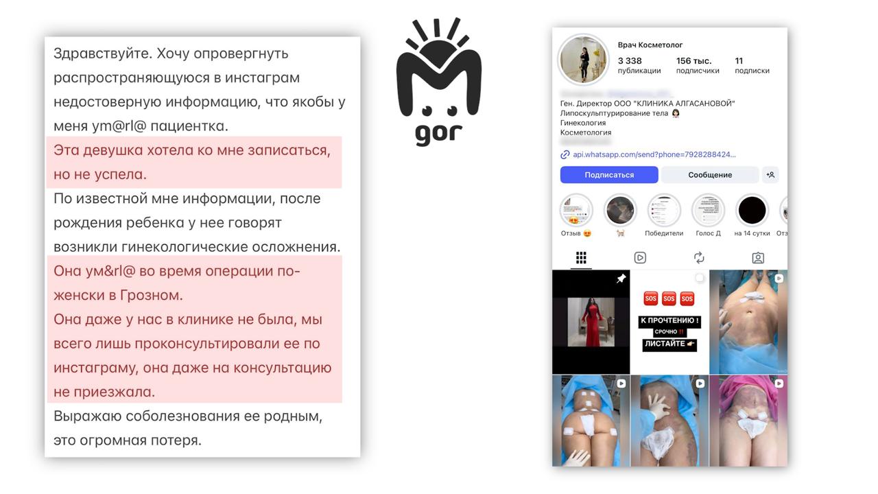 Врача зовут Раисат Алгасанова. Клиентки говорят, что процедура проходит в небезопасных условиях. У многих из-за неё появился некроз, абсцессы и сепсис. На днях в Грозном скончалась девушка, которая, якобы, была пациенткой Алгасановой. Сама Раисат это отрицает, говорит, что погибшая пообщалась с ней в соцсетях, но на процедуру не попала.