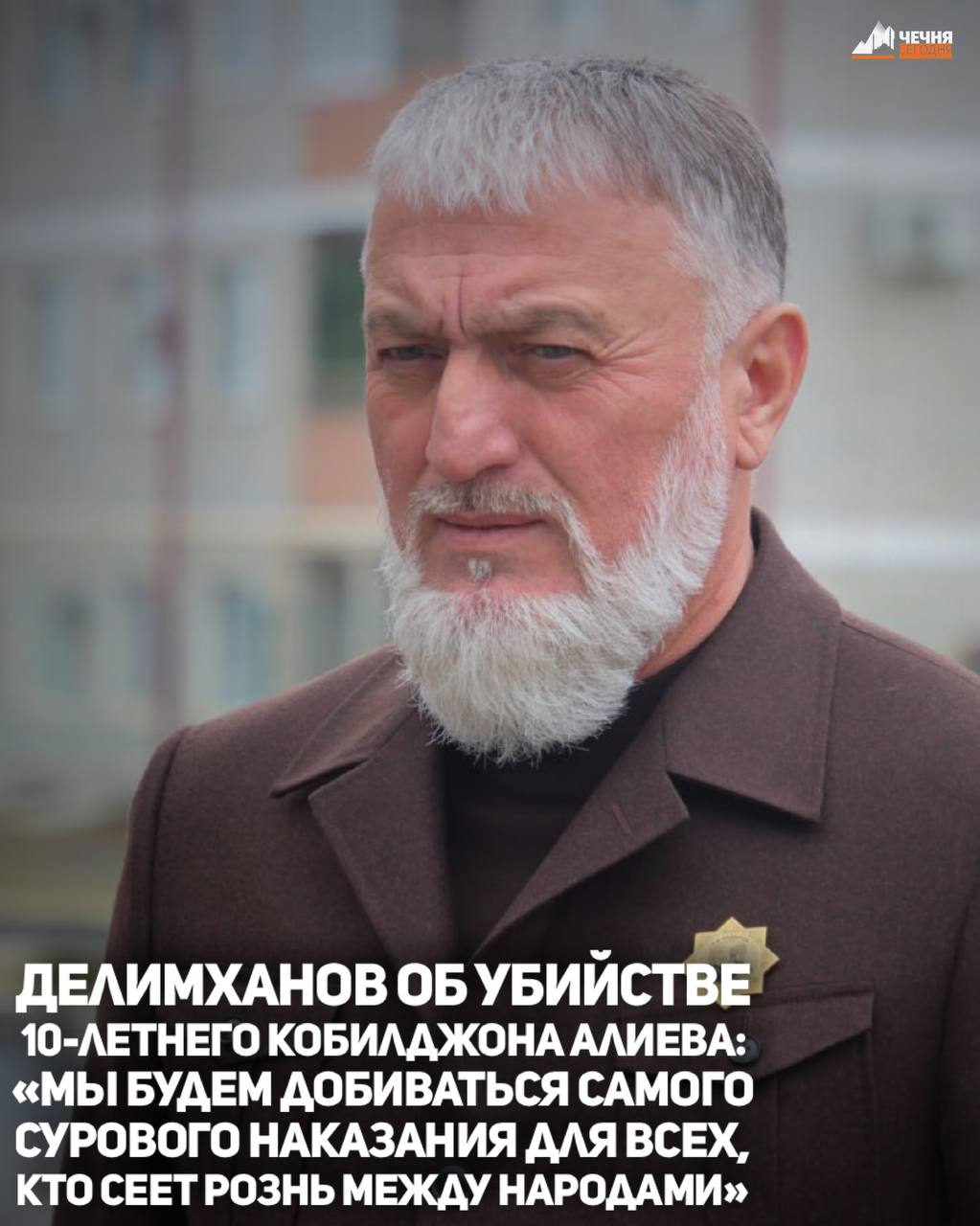 — На днях в подмосковном Одинцове произошло жестокое и бесчеловечное преступление, которое шокировало всю страну. Настоящий нацист напал на 10-летнего Кобилджона Алиева и хладнокровно лишил его жизни. От имени депутатов Государственной Думы, сенаторов Российской Федерации от Чеченской Республики и от себя лично выражаю искренние соболезнования родным и близким мальчика, — написал Делимханов в телеграм-канале.