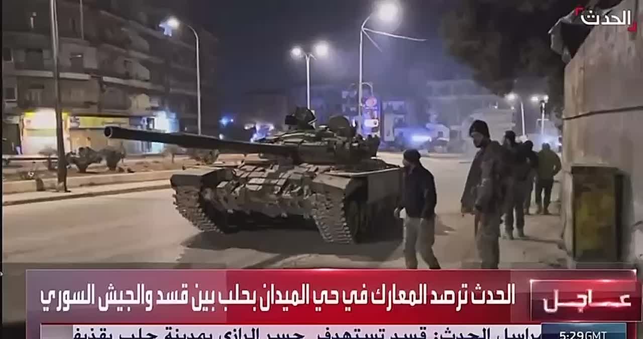 В Алеппо прибывают подразделения ХТШ, теперь называемые новой сирийской армией, на видео прибывший танк правительственных войск вступает в боестолкновения с ополчением СДС.