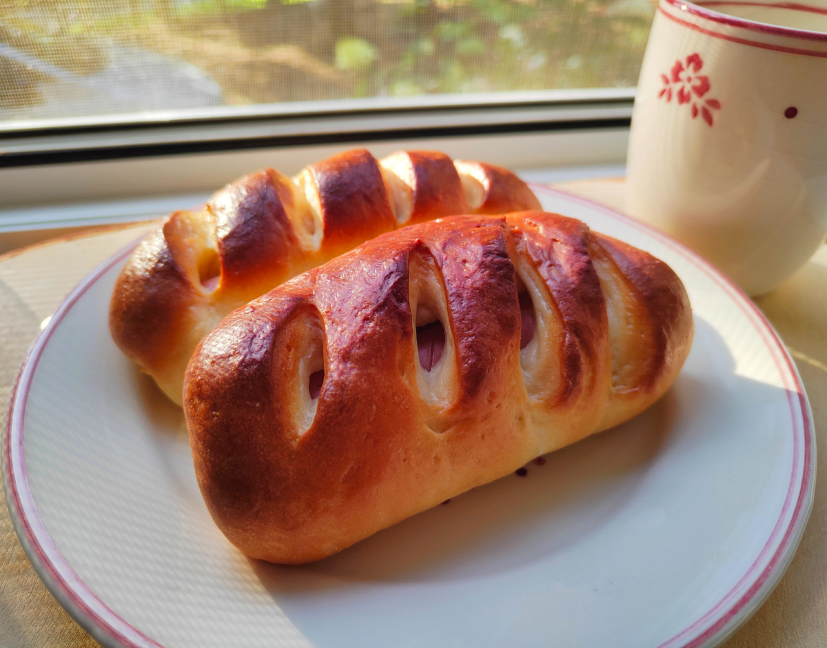 Когда тесто увеличится в объёме, разделите его на пять равных частей, каждую из которых внимательными движениями превратите в круглые шарики. Раскатайте каждый шарик в лепешку, достаточную по размеру для обертывания сосиски. Поместите сосиску на край лепешки и аккуратно скатайте, при этом края плотно защипите, чтобы сохранить форму при выпекании. Переложите заготовки на противень со стороны швам вниз и сделайте несколько надрезов на поверхности теста.