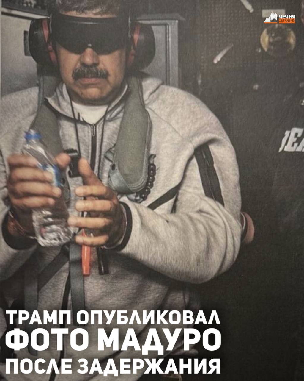 На фотографии Мадуро стоит со скованными руками, его лицо и глаза частично скрыты маской. На президента Венесуэлы надели наушники, ограничивающие слышимость.