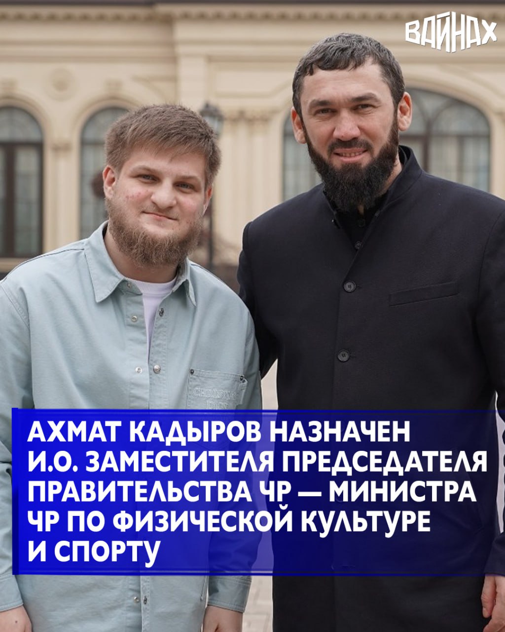 Ахмат Кадыров назначен исполняющим обязанности заместителя Председателя Правительства ЧР — министра ЧР по физической культуре и спорту по представлению руководителя кабинета министров Магомеда Даудова. Об этом сообщил глава региона Рамзан Кадыров в своём Telegram-канале.