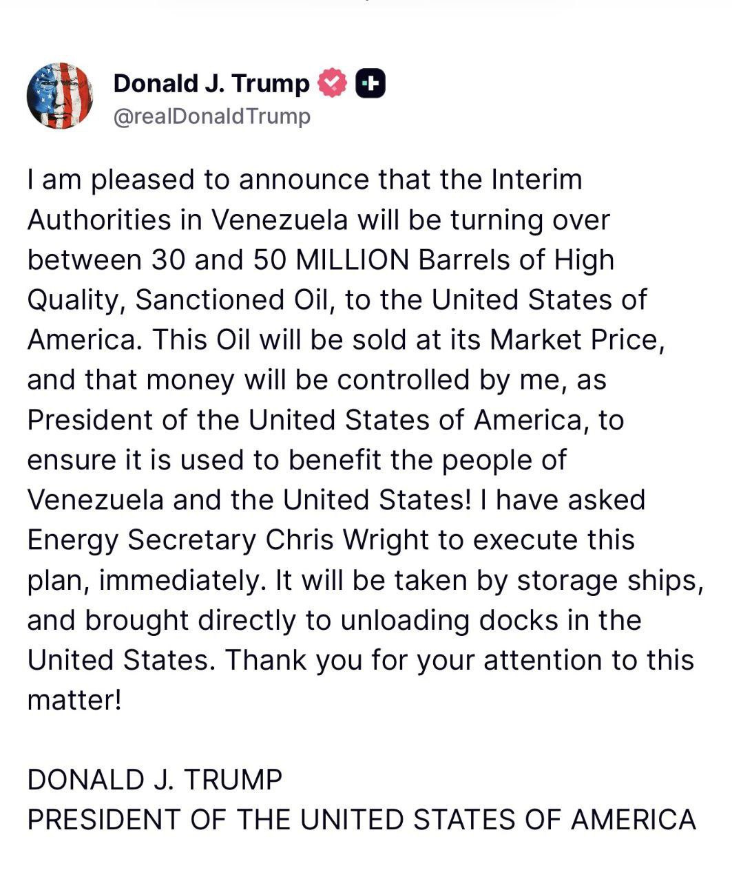 Президент США по сути даже не скрывает, зачем история с похищением Мадуро затевалась. Он заявил о соглашении с временными властями Венесуэлы на поставку крупной партии нефти в Соединенные Штаты. Объем поставки оценивается от 30 до 50 млн баррелей, ранее находившихся под санкциями.