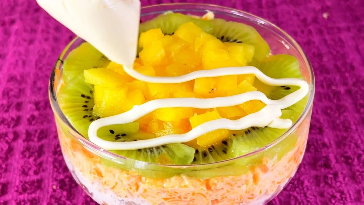 Заправка также играет важную роль: 1–2 столовые ложки майонеза или смеси майонеза со сметаной обеспечат нужную кремовую консистенцию. Для украшения можно использовать любые фрукты, например, киви, что придаст блюду особую эстетику.