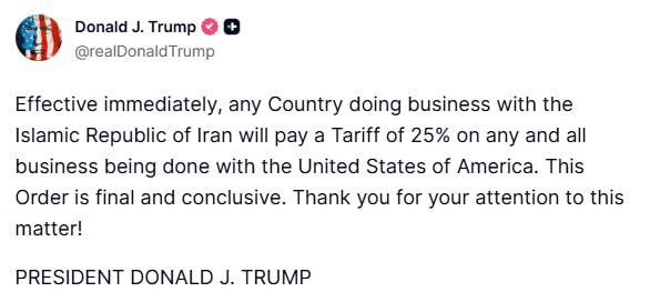 Дональд Трамп о фактическом росте тарифов для Китая и других экономических партнёров Ирана на 25%.