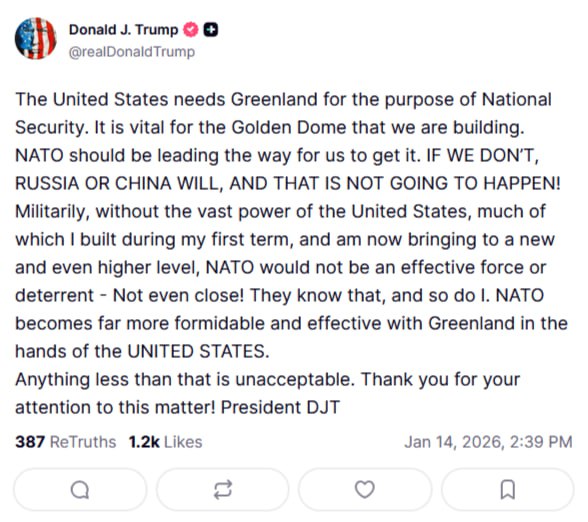 "Соединенным Штатам нужна Гренландия для обеспечения национальной безопасности. Она жизненно важна для "Золотого купола", который мы строим. НАТО должно помочь нам в этом. ЕСЛИ МЫ ЭТОГО НЕ СДЕЛАЕМ, ЭТО СДЕЛАЮТ РОССИЯ ИЛИ КИТАЙ, А ЭТОГО НЕ ДОЛЖНО ПРОИЗОЙТИ! В военном плане, без огромной мощи Соединенных Штатов, которую я в значительной степени создал во время своего первого срока и сейчас вывожу на новый, еще более высокий уровень, НАТО не будет эффективной силой или сдерживающим фактором – даже близко! Они это знают, и я тоже. НАТО станет гораздо более грозной и эффективной силой, если Гренландия будет в руках СОЕДИНЕННЫХ ШТАТОВ.Все, что меньше этого, неприемлемо. Спасибо за внимание к этому вопросу! Президент DJT",
