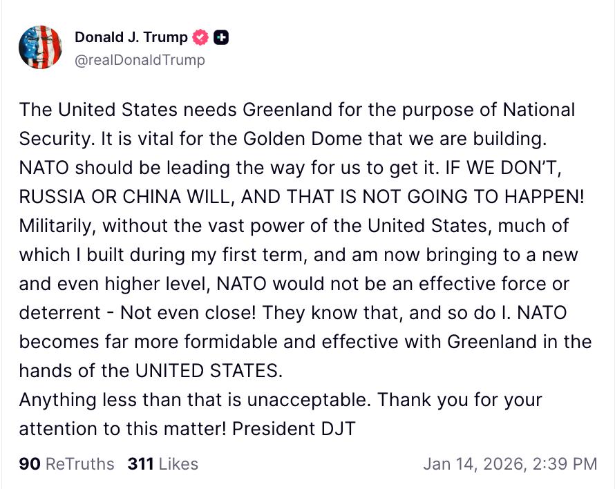 «НАТО должно помочь нам получить ее (Гренландию). Если мы этого не сделаем, это сделают Россия или Китай, а этого не произойдет. Без огромной мощи Соединенных Штатов НАТО не было бы эффективной силой или средством сдерживания — даже близко к этому. НАТО становится гораздо более грозным и эффективным с переходом Гренландии в руки Соединенных Штатов. Все, что меньше этого, неприемлемо».