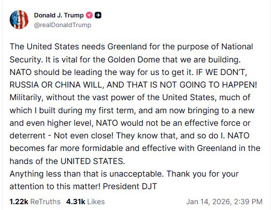 ‘Соединённым Штатам нужна Гренландия в целях национальной безопасности. Она имеет жизненно важное значение для ‘Золотого купола’, который мы строим. НАТО должно возглавить усилия, чтобы мы получили её. ЕСЛИ МЫ ЭТОГО НЕ СДЕЛАЕМ, ЭТО СДЕЛАЮТ РОССИЯ ИЛИ КИТАЙ — И ЭТОГО НЕ БУДЕТ!