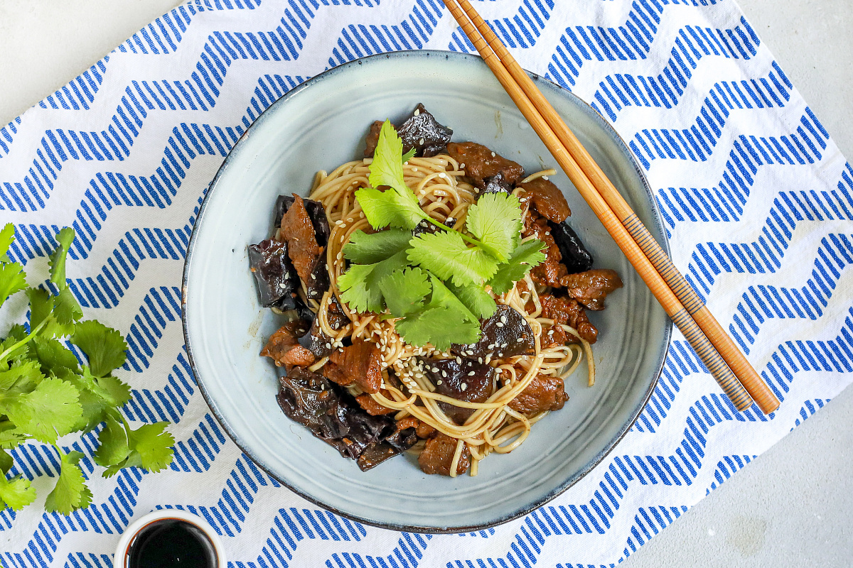 На завершающем этапе слейте воду с грибов и добавьте их в сковороду, готовьте ещё 2-3 минуты и приправьте по вкусу. Подавайте рамен: в глубокую тарелку положите лапшу, а сверху слой говядины. Украсьте блюдо свежей кинзой и посыпьте кунжутом, чтобы добавить нотку изысканности.