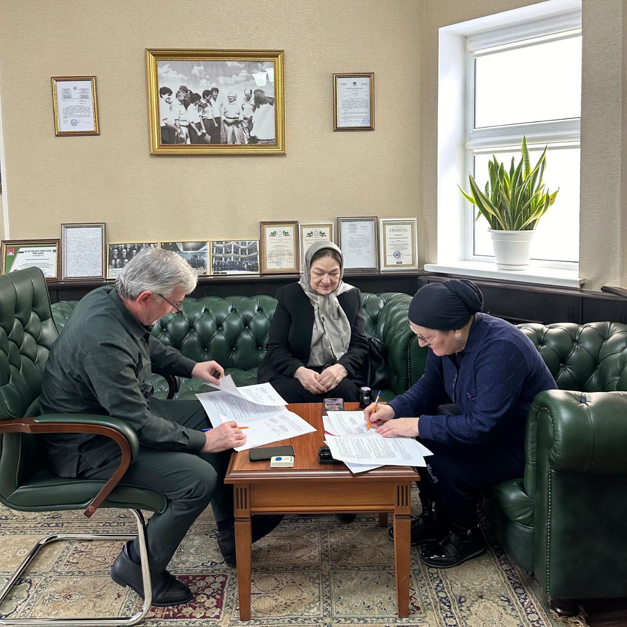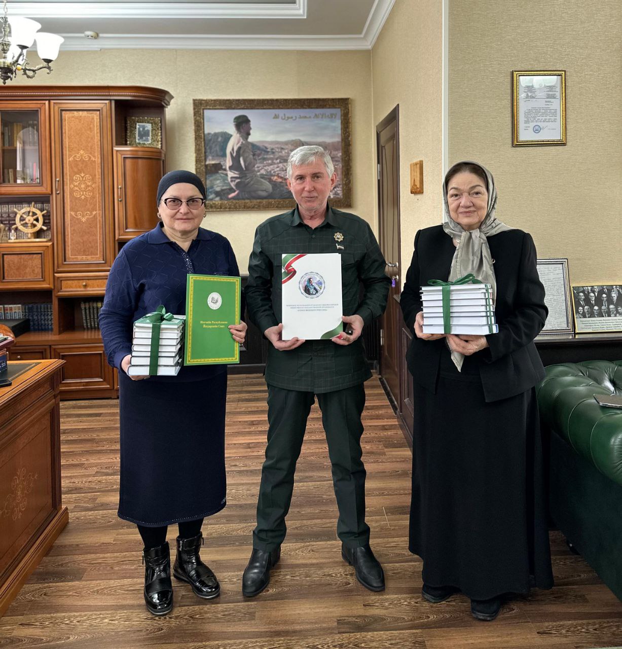 Председатель Комитета Парламента Чеченской Республики по межпарламентским связям, национальной и информационной политике и взаимодействию с общественными организациями, председатель Союза писателей ЧР Аламахад Ельсаев встретился с председателем Чеченского регионального отделения Общероссийской общественно-государственной организации «Союз женщин России» Сацитой Уциевой и членом Союза писателей России и Союза женщин России Розой Дахаевой.