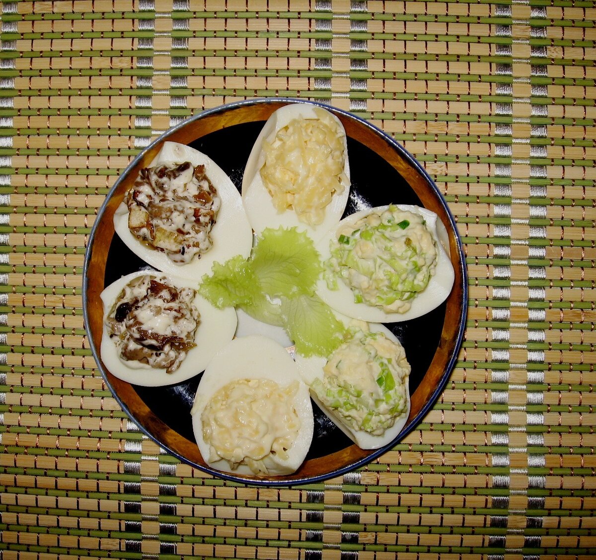 Первая начинка: желтки стоит размять, добавив мелко нарезанный зеленый лук. Затем мелко нарезать листья салата и соединить с желтками, посолить и заправить сметанным соусом с грибами. Завершающий штрих – аккуратное перемешивание всех ингредиентов для создания однородной массы.