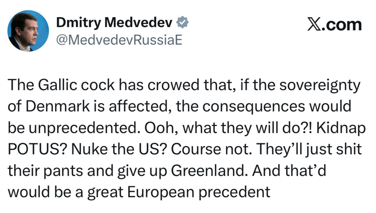 Галльский петух прокукарекал, что, если будет затронут суверенитет Дании, последствия будут беспрецедентными. О, что они будут делать?! Похитят президента? Нанесут ядерный удар по США? Конечно, нет. Они просто наложат в штаны и откажутся от Гренландии. И это стало бы отличным европейским прецедентом.