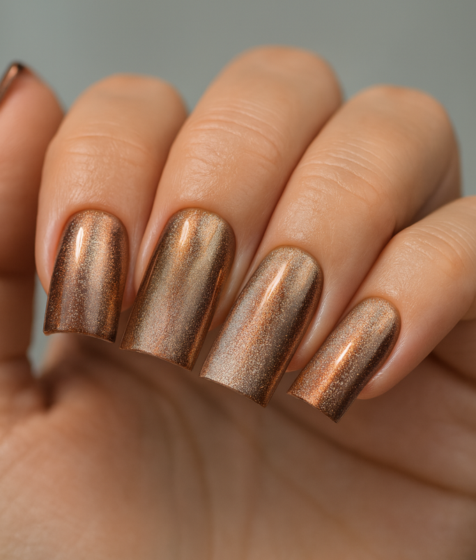 - Шоколадный «кошачий глаз». Этот маникюр привлекает внимание благодаря переливам от насыщенного какао до легкого карамельного. Гладкие линии и яркий блеск создают эффектный вид, который отлично дополнит ваш праздничный наряд.