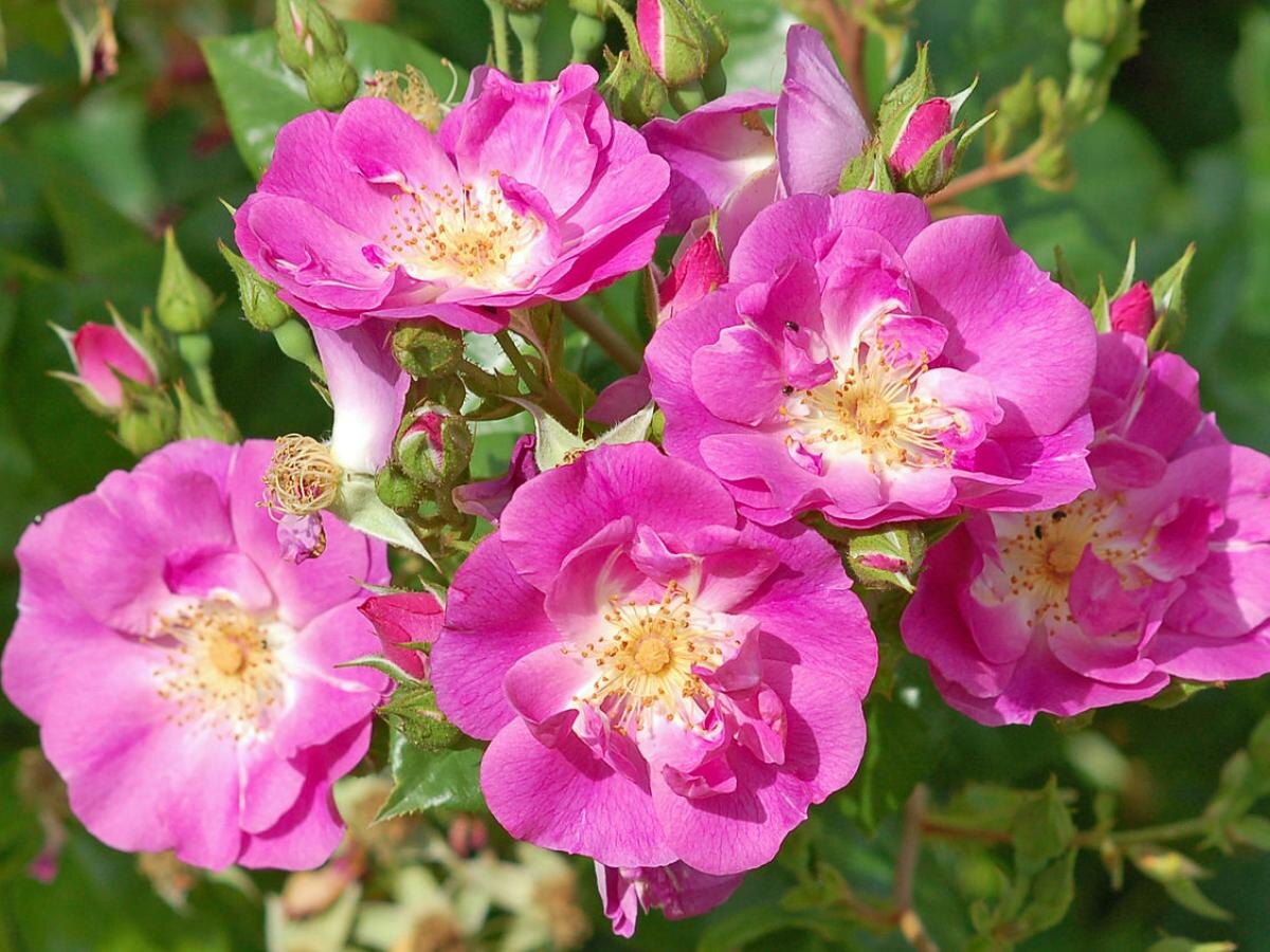 Сорт «Магнолия» радует глаз крупными, насыщенно-розовыми цветами с непередаваемым ароматом. Эти розы великолепно выглядят как в одиночных посадках, так и в групповых композициях. Высота кустов достигает 70-90 см, что делает их идеальным выбором для живых изгородей. Период цветения – с конца весны до осени.