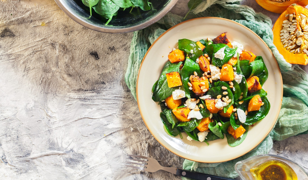 6. Сборка: в большой миске объединить запеченную тыкву, шпинат и орехи, добавить заправку и аккуратно перемешать. Разложить по тарелкам и добавить кусочки сыра сверху.