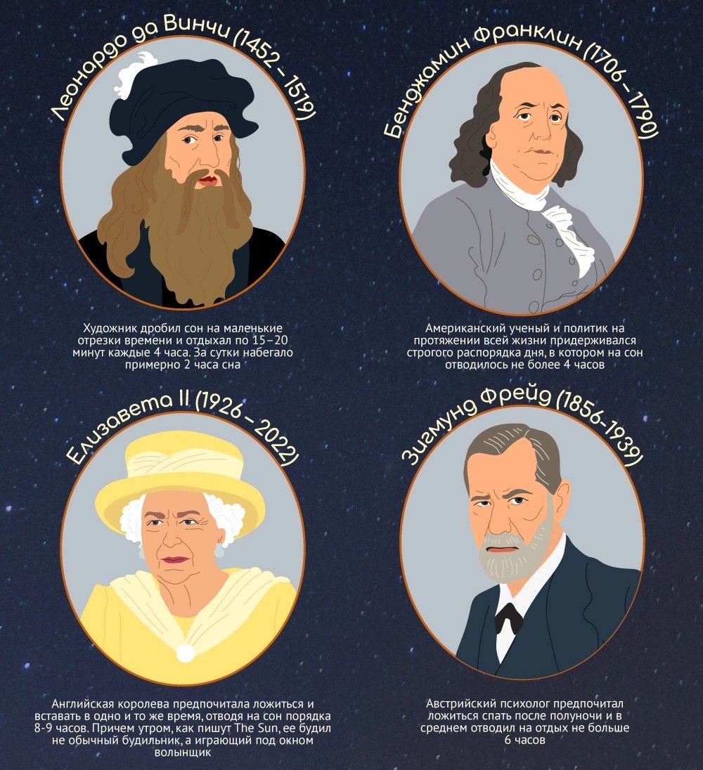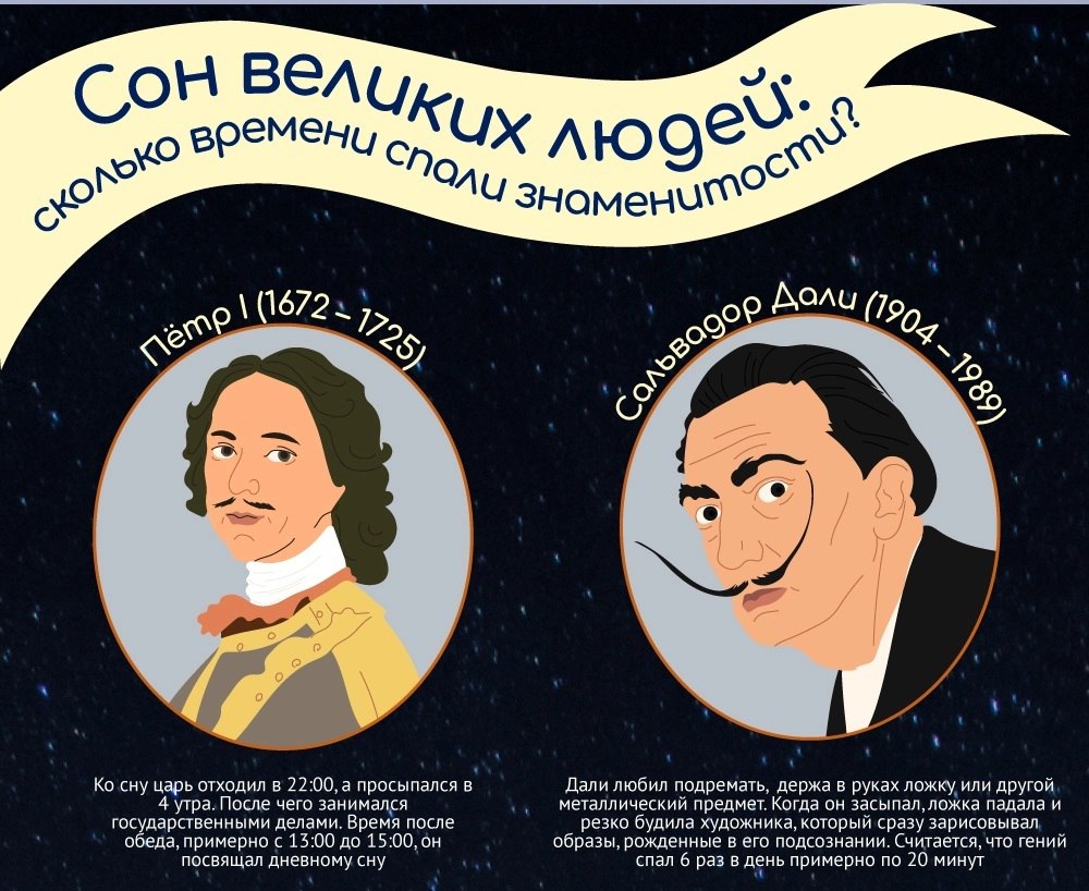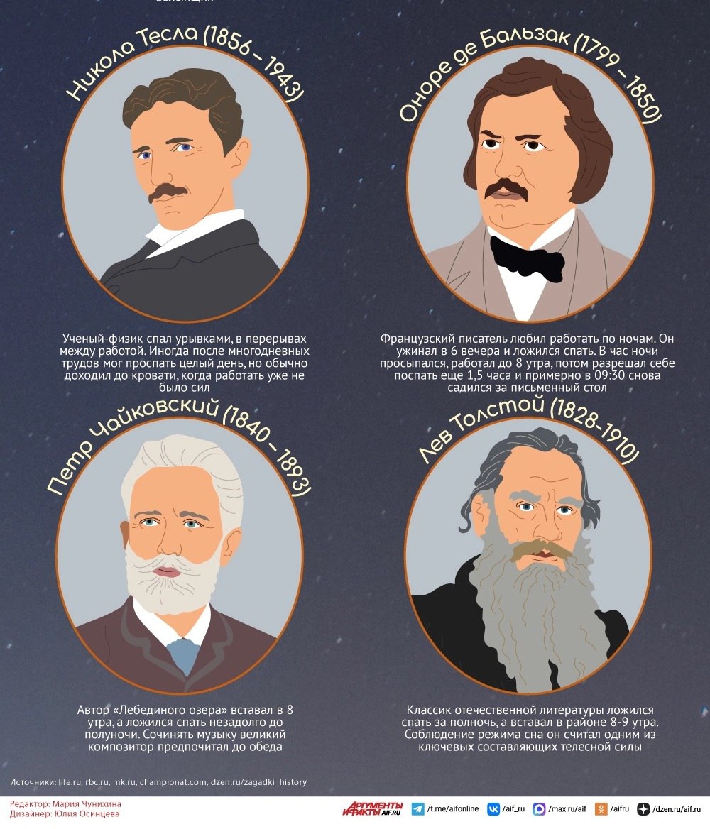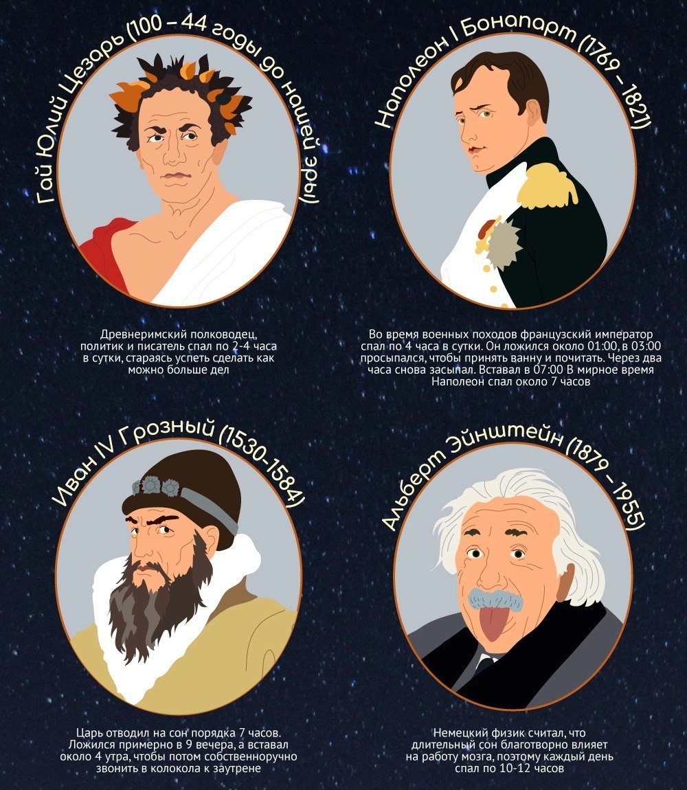 Современная норма сна для взрослого человека составляет не меньше 7-8 часов в сутки. Дошедшие до нас источники свидетельствуют о том, что многие исторические личности придерживались своего распорядка дня, не всегда совместимого с понятием «здоровый сон». Смотрите в инфографике aif.ru, как отдыхали Лев Толстой, Наполеон, Петр I, Альберт Эйнштейн, Дали, Иван Грозный и многие другие.