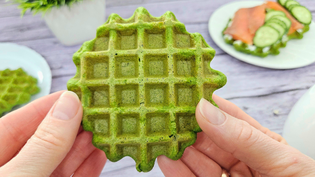 Эти зеленые вафли идеально подаются с творожным сыром и кусочками семги, создавая гурманское сочетание, которое не оставит равнодушным.