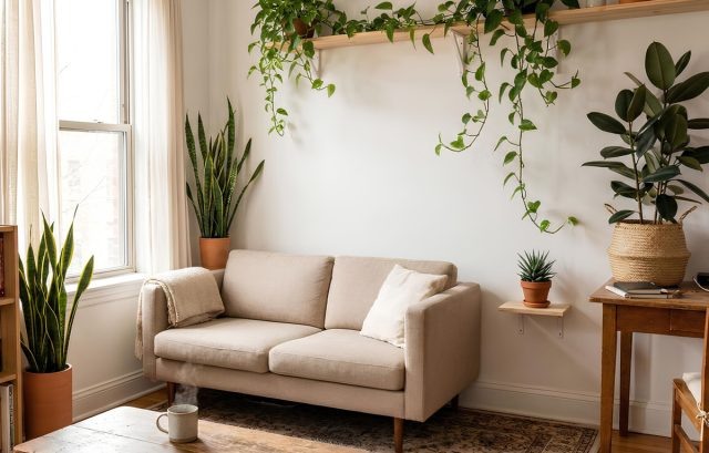 Когда горизонтальные поверхности заняты, подвешенные растения — отличный выход. Они создают свежий и живой вид в интерьере, не забирая полезное пространство.