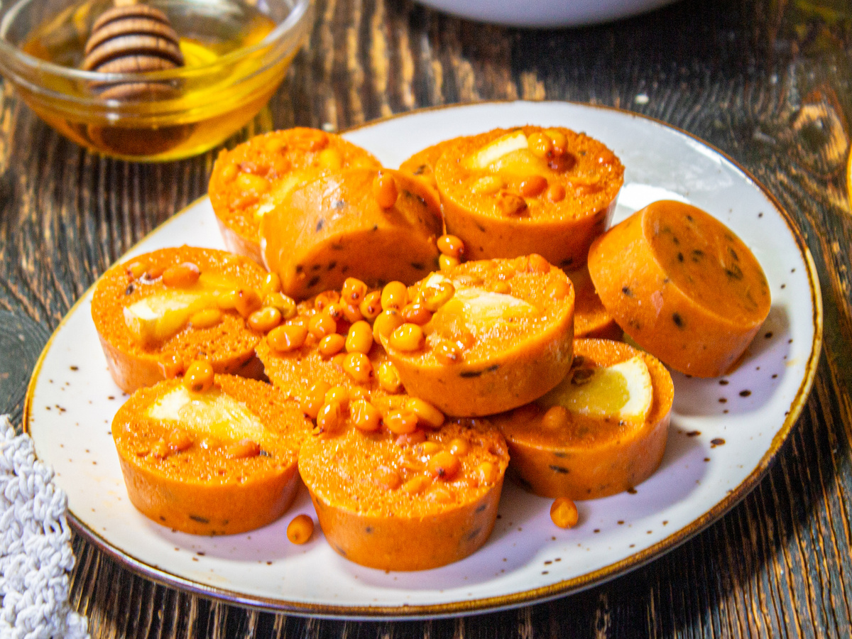 2. Полученную массу нужно разложить в силиконовые формочки — отлично подойдут как формы для льда, так и для кексов. Для красивого оформления можно положить сверху кружочки апельсина или целые ягодки облепихи. Убрать в морозильник минимум на 3-4 часа для полного застывания.